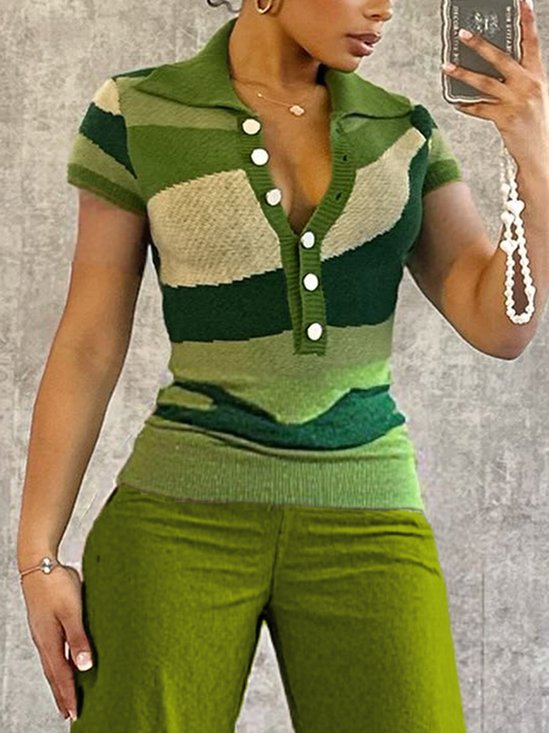 Elegant Farbblock Geknöpft Schalkragen Pullover
