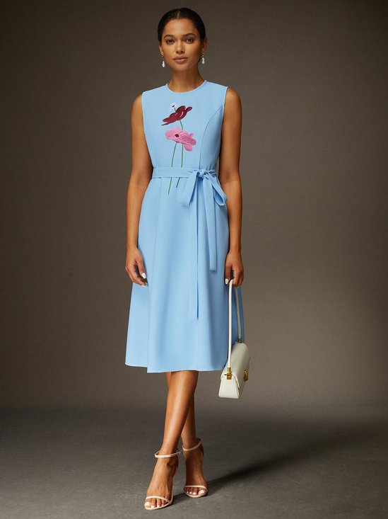 Urban Unifarben Stehkragen Knielänge Kleid mit Gürtel