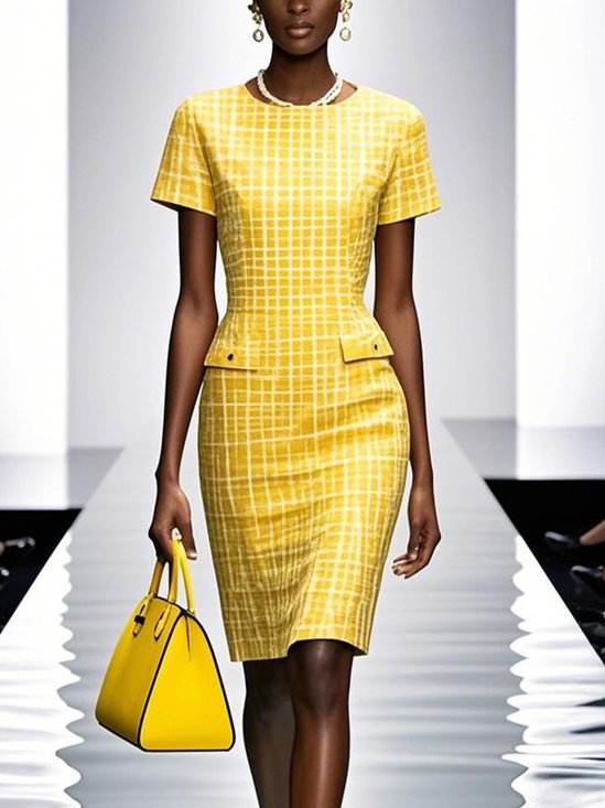 Urban Unifarben Normale Ärmel Reißverschluss Rundhals Midikleid
